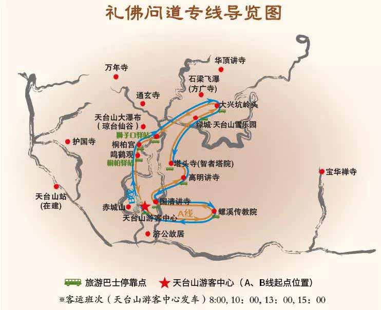 ◆A線:(沿天培線)天臺山游客中 心—國清寺—高明寺—智者塔院—天臺山雪樂園—獅子口驛站—桐柏宮—桐柏驛站(含鳴鶴觀)—天臺山游客中 心